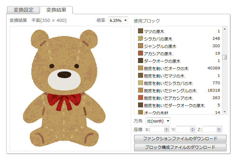 となっており、ブロック構成通りにブロックを並べれば変換結果の画像が再現できるようになっています。