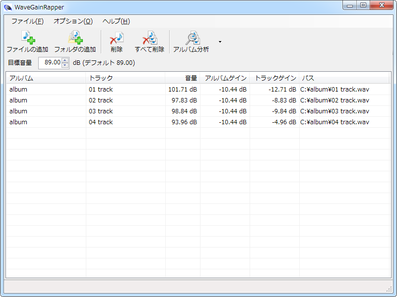 目標音量を使用してアルバム単位の分析後、ゲイン処理を行います。