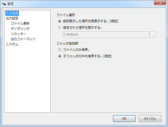 「ファイルの追加」「フォルダの追加」にて初期表示されるパスの指定を行えます。